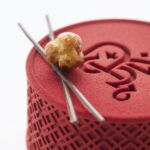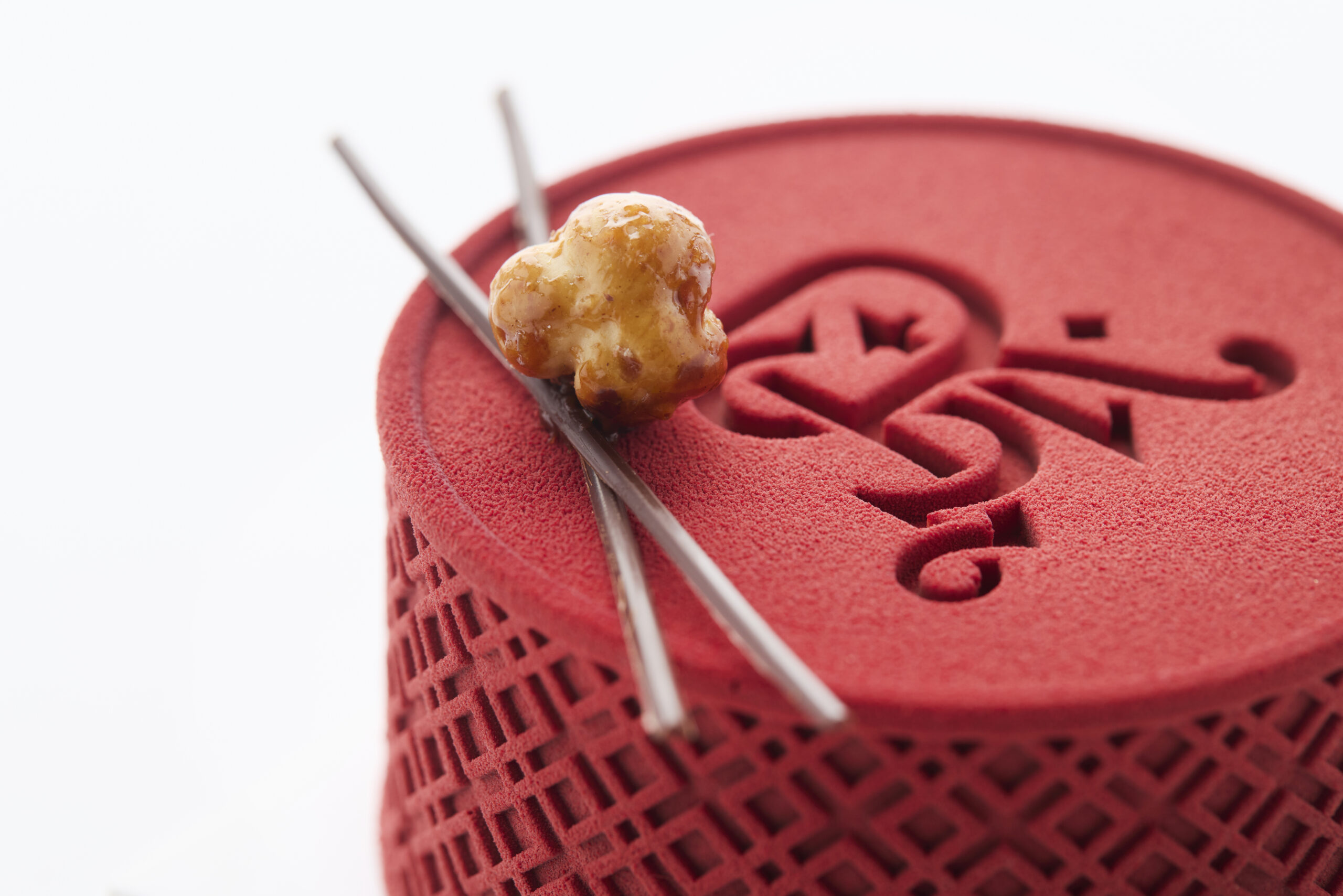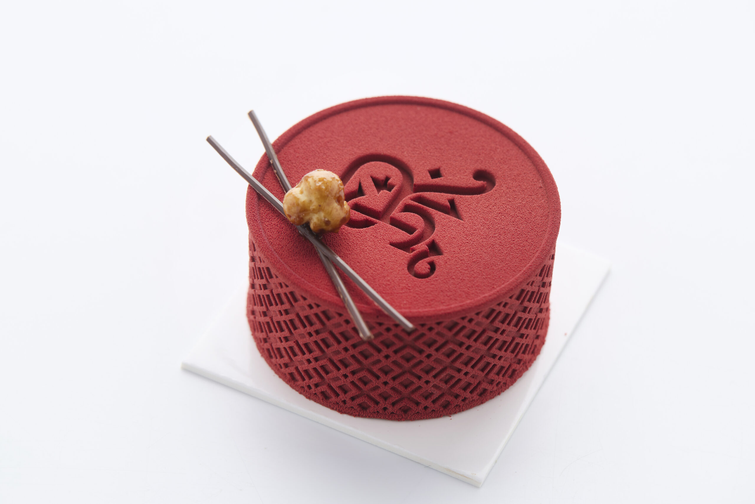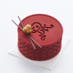 A masterfully crafted cylindrical cake, encircled with an intricate motif and crowned with the iconic St. Regis monogram. It is a true expression of timeless sophistication and artisanal elegance.