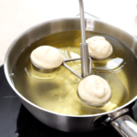 A high-quality stainless steel stamp for making three beignets at once! This metal pie tee stamp, made in The Netherlands, is perfect for both hot and cold preparations. This stamp can be used to make crispy batter beignets that can be filled before and finished afterward.